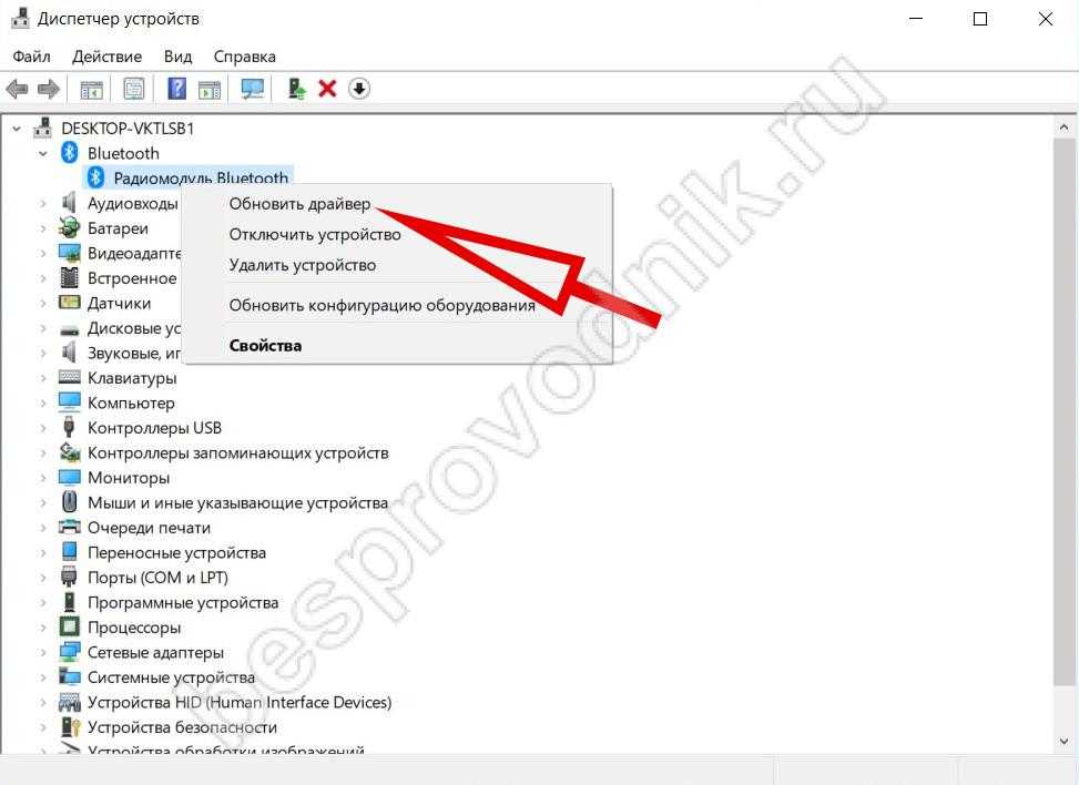 - Найти радиомодуль Блютуз и вызвать меню щелчком правой кнопки. Выбрать «Обновить».