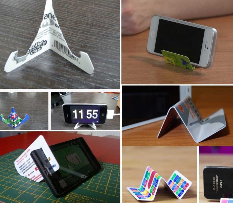Компактную подставку можно сделать из пластиковой карты. Учитывая, что банковская карточка после такого апгрейда станет непригодной к использованию по прямому назначению, лучше использовать ненужную дисконтную карту или подарочный сертификат.