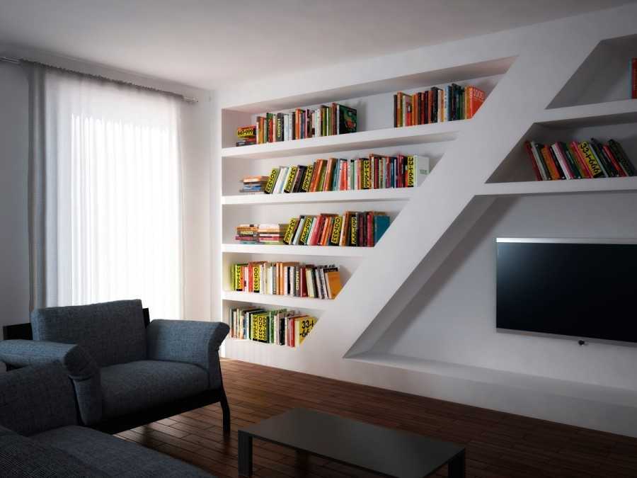 Конструкции из гипсокартона также очень удобны, ведь им можно придать любую форму и монтировать своими руками. Сделать разметку, прикрепить металлические или деревянные направляющие, обшить листами гипсокартона, а затем зашпаклевать и окрасить готовую полку. Большой популярностью пользуются изделия в тон стены – они смотрятся как единое целое и не загромождают помещение.