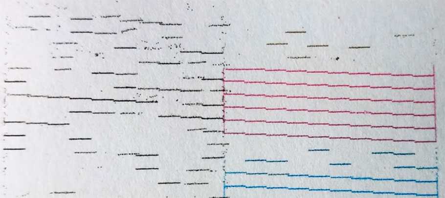 Когда на печатаемом изображении появляются пропуски, вместо черного цвета, неисправность может заключаться в разгерметизации. Она возникает из-за попадания воздуха в канал подачи краски или засыхании чернил. Часто эта проблема решается промывкой уплотнительных резинок. Только в крайнем случае приступают в механическому ремонту самой печатающей головки.