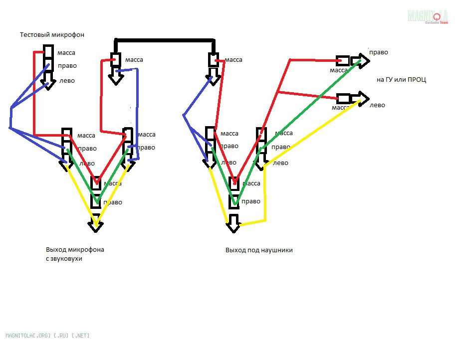 При обрыве кабеля внутри штекера или невозможности снять с него защитную оболочку необходимо определить соответствие проводов динамикам, микрофону и панели управления. При этом возможны разные варианты схем соединения: