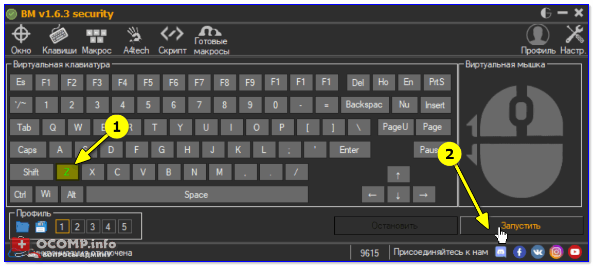 Собственно, здесь приступим к программированию 7-й кнопки. Менеджер макросов от Оскар для модельного ряда игровых мышей A4Tech X7 запущен.
