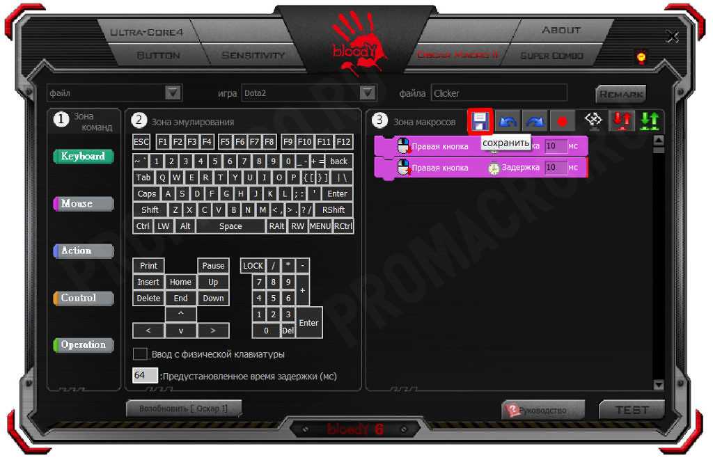 Итак, давайте интерпретируем скрипт человеческим языком. У нас установлен 2й режим работы для макроса, т.е. при нажатии и удержании кнопки макрос будет работать по кругу, в начале он нажмет правую кнопку мыши и будет удерживать ее на протяжении 10мс, затем отожмет эту кнопку и через 10мс нажмет заного и будет удерживать 10мс и тд. Сохраняем наш макрос нажатием на “дискетку”.