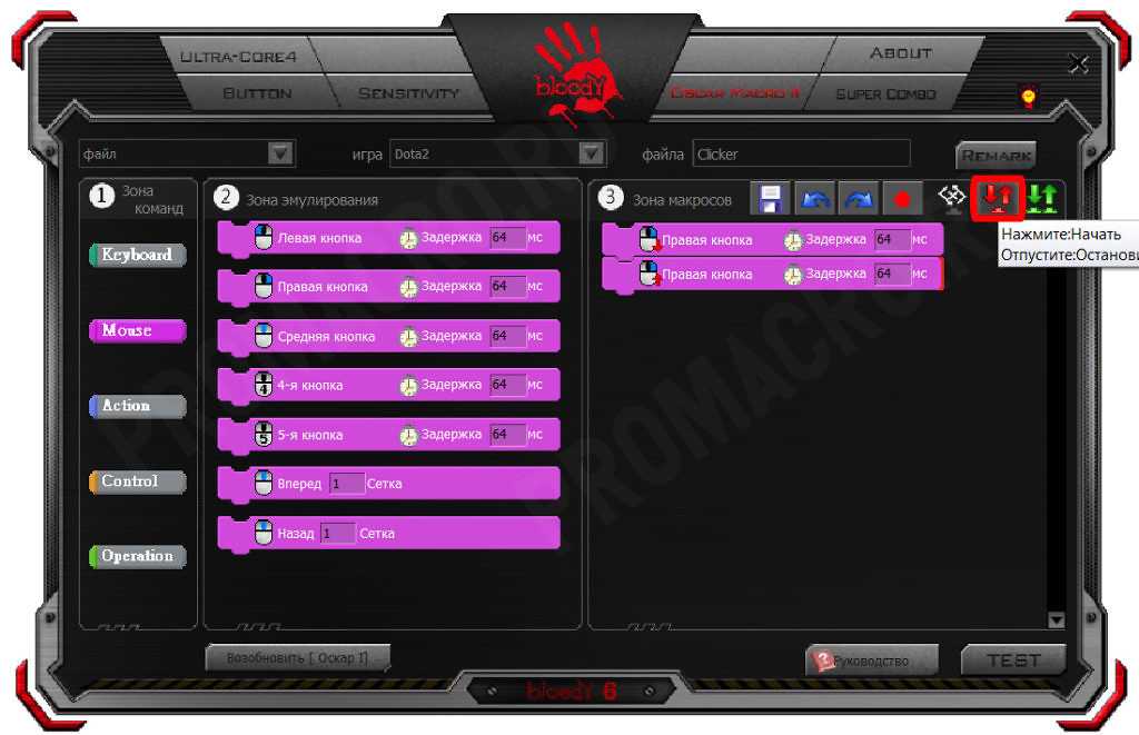 Теперь начинается самое интересное. Так как мы будем эмулировать нажатия правой кнопки мыши, то необходимо перенести “Правая кнопка” из зоны эмулирования в зону макроса, вообщем зажимаем мышкой и переносим, должно получиться вот так: