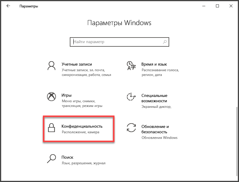 1 Нажимаем на клавиатуре «Win+I» и попадаем в меню «Параметры». Здесь выбираем «Конфиденциальность».