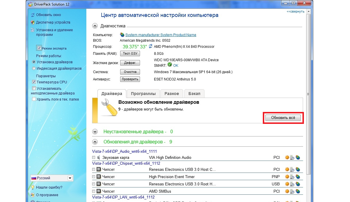 А также можно скачать и установить программу DriverPack Solution. Она позволяет сканировать весь компьютер на наличие последних доступных драйверов. Если у клавиатуры будут неправильные (грубо говоря «поломанные») или неактуальные драйвера, вы легко сможете их обносить. Использование этой программы выглядит следующим образом: