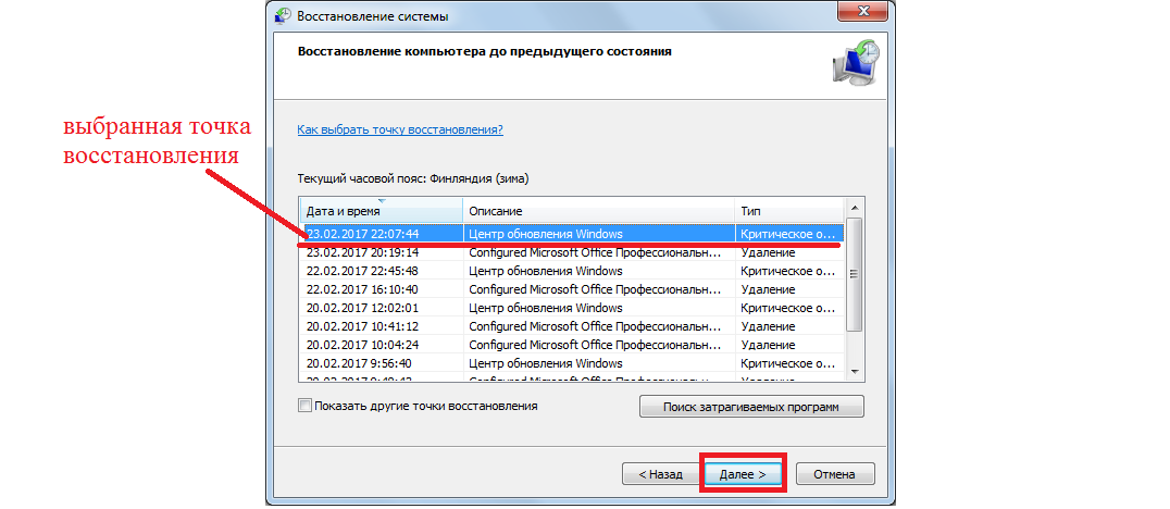 - дальше выберете желаемую точку восстановления, а они здесь отсортированы по датам и времени (выбирать нужно ту, которая наиболее точно соответствует времени, когда все было хорошо);