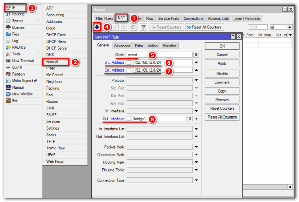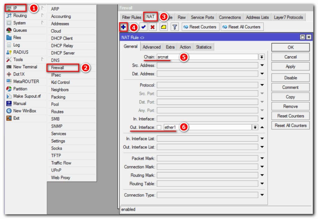 Если мы получаем статический IP от провайдера, то рекомендуем для настройки NAT на MikroTik использовать правило src-nat. Это позволит устройствам из LAN выходить в глобальную сеть интернет. Откроем: