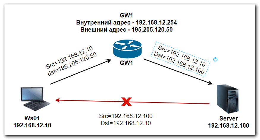 Если хост локальной сети (Ws01) обращается к серверу, находящемуся в этой же сети по внешнему IP, то сервер, получив запрос, зная, что данное устройство находится в одной LAN с IP 192.168.12.10 отвечает ему напрямую. Хост не принимает данный ответ, так как не обращался к серверу по айпи 192.168.12.100.