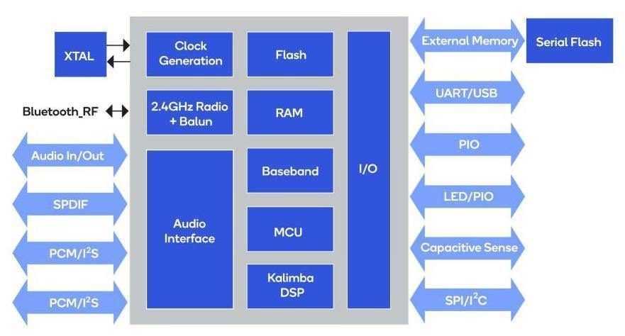 Чипсет работает под управлением программируемого 80-МГц RISC-процессора. Аудиосигнал обрабатывает встроенный 24-битный процессор Kalimba DSP. На борту, между прочим, стерео 24-битный АЦП с частотой дискретизации до 96 кГц, а встроенный стерео 24-битный ЦАП реализует частоту дискретизации до 192 кГц — параметры заданы с запасом.