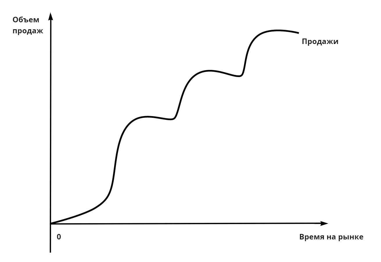 Она же — модель новых подъемов. Кривая с повторяющимися периодами роста, в которой нет этапа спада.