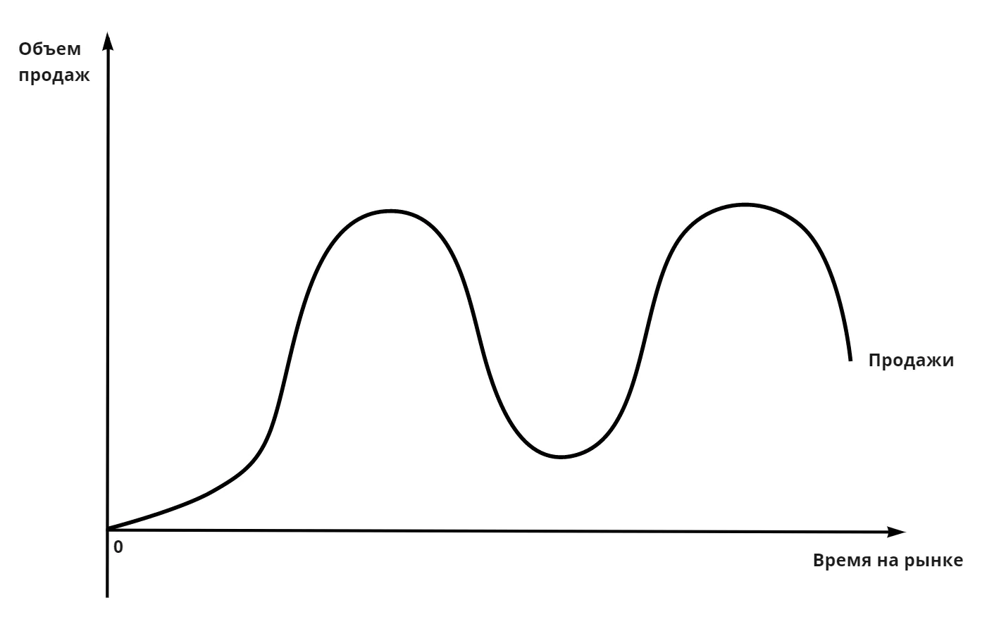 Примеры. Такая кривая характерна для брендов одежды, когда новая вещь переходит в стадию тренда, но не все готовы ее носить — и только поклонники марки покупают продукт. Также это можно отнести к товарам, которые не входят в масс-маркет: магнитофонам, спиннерам, MP3 плеерам и электронным книгам, которые сейчас покупают только фанаты.