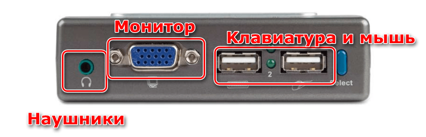 - Монитор, акустику и мышь с клавиатурой подключаем к соответствующим разъемам на противоположной стороне переключателя. После этого можно включать компьютеры и начинать работу.