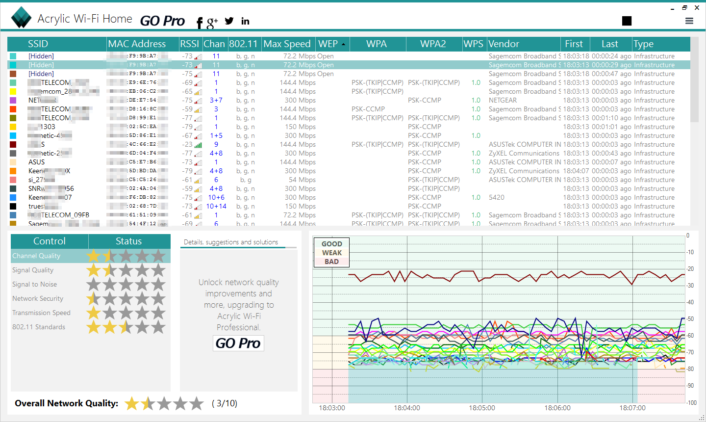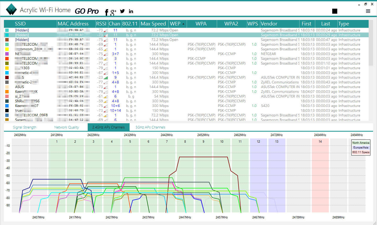 Этот сканер Wi-Fi, созданный в Tarlogic Security, имеет побольше возможностей, чем WiFi Analyzer, но все самое интересное доступно только в платной версии. Программа работает в Windows с 7 по 10, поддерживает диапазоны 2,4 и 5 ГГц, стандарты 802.11b/g/n/ac, имеет свою систему плагинов и собственные драйверы для популярных Wi-Fi-адаптеров. Благодаря этому она может работать и как снифер, интегрируясь с Wireshark.