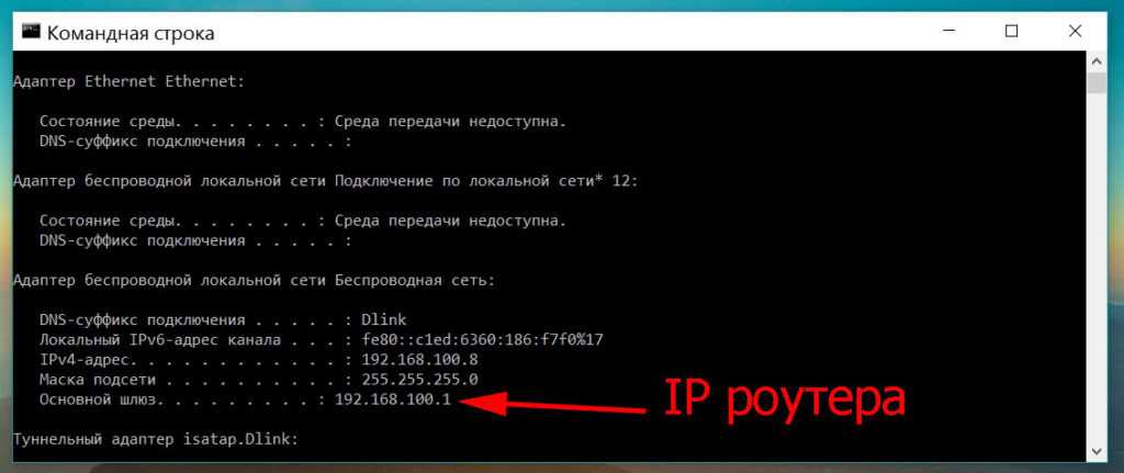 Узнать IP роутера несложно, достаточно запустить командную строку, вводом в «Поиск» команды «cmd». В появившейся командной строке вбейте команду «ipconfig». Интересует строка «Основной шлюз», напротив неё будет написан IP адрес роутера.