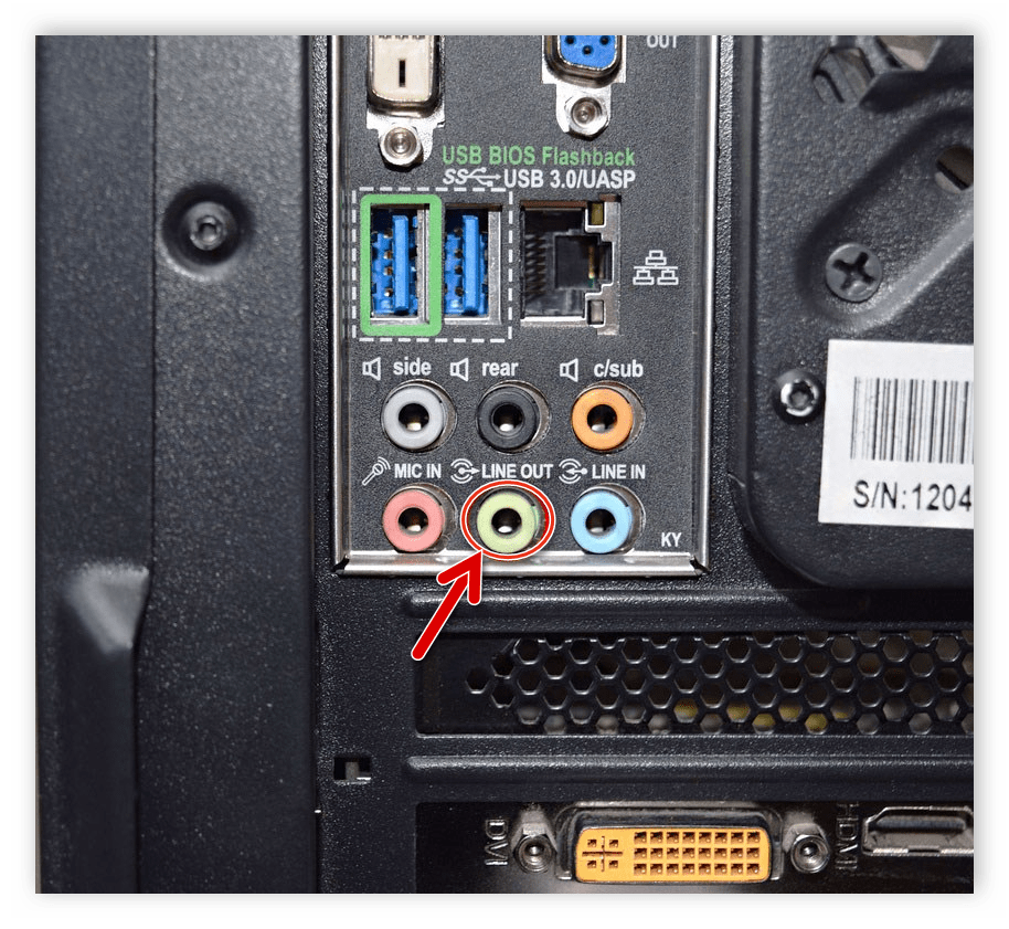 В случае с динамиками нас будет интересовать последний разъем, а в качестве подсказки будет выступать цвет штекера, идущего от колонок. Как правило, он окрашен в цвет, соответствующий порту на звуковой карте. Не перепутайте его, так как при ошибке ни один из далее рассмотренных способов не поможет решить проблему.