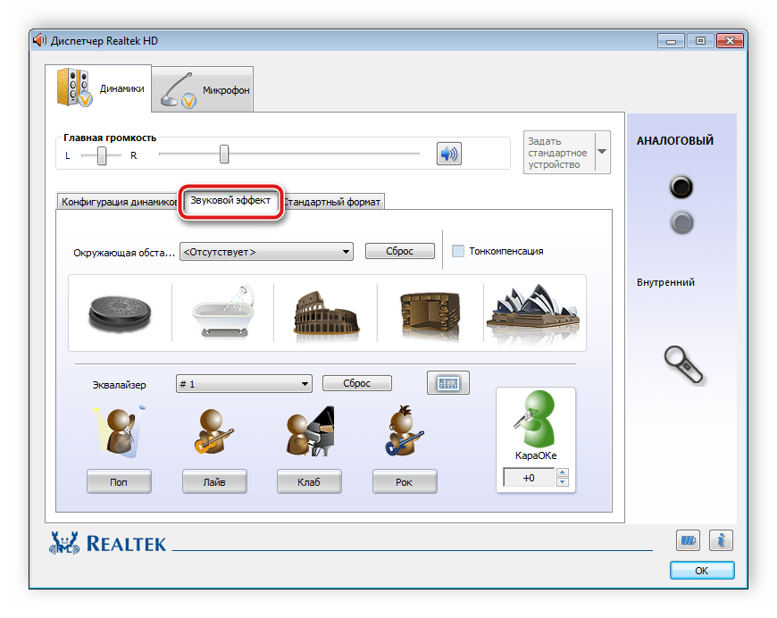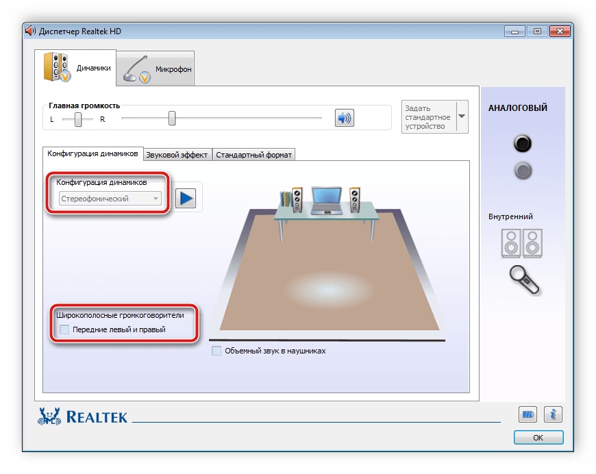 Если динамики в колонке играют неправильно, рекомендуем подключить устройства к правильным портам. Быстрее способ – сменить назначение разъемов. Для этого справа в диспетчере есть столбец «Аналоговый». Кликаем ПКМ по неправильно установленному порту и выбираем «Смена назначения разъемов». Устанавливаем правильное устройство. Здесь же присутствуют большие возможности для управления звуком в Windows 10 (на вкладке «Звуковой эффект»).