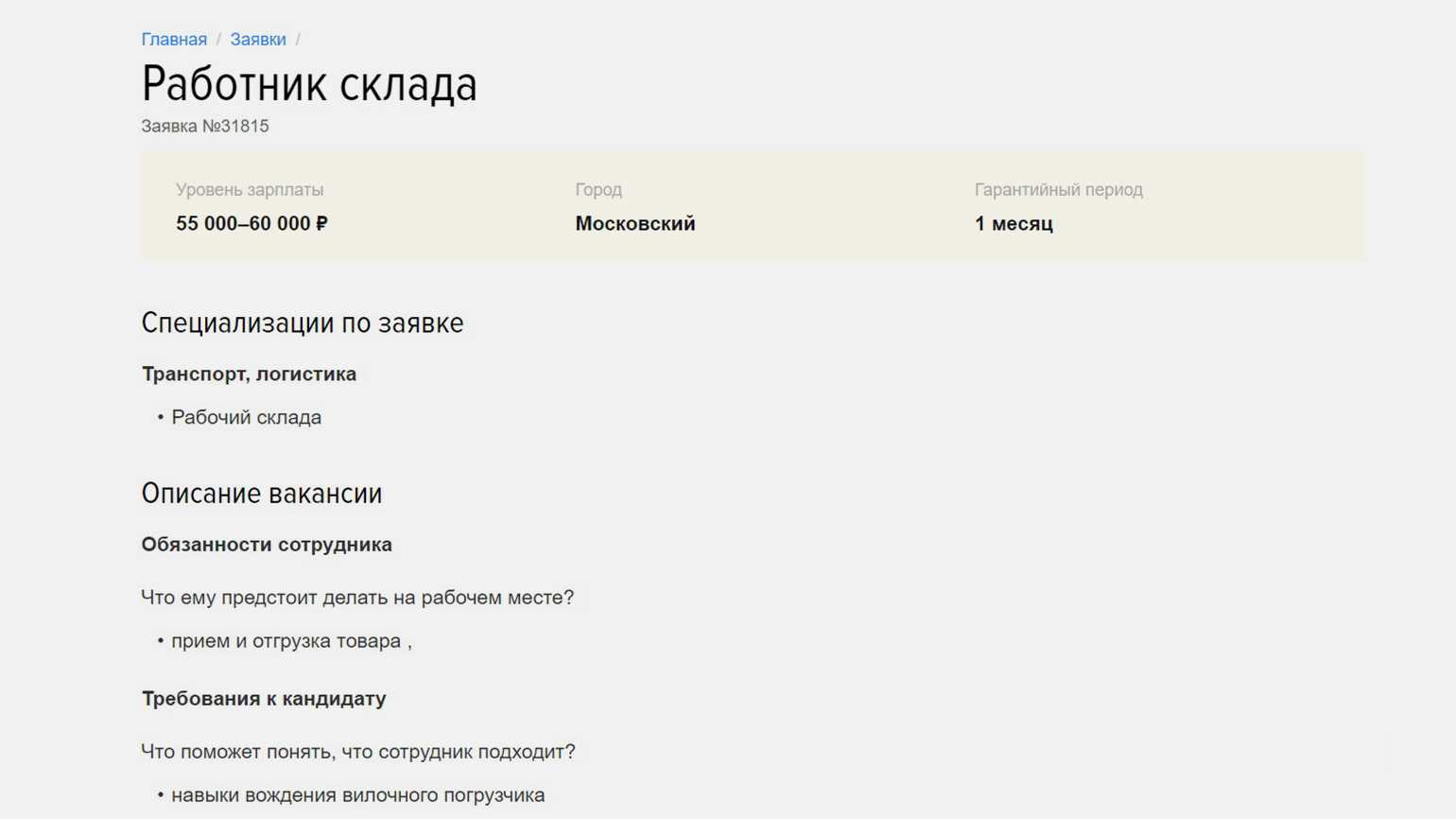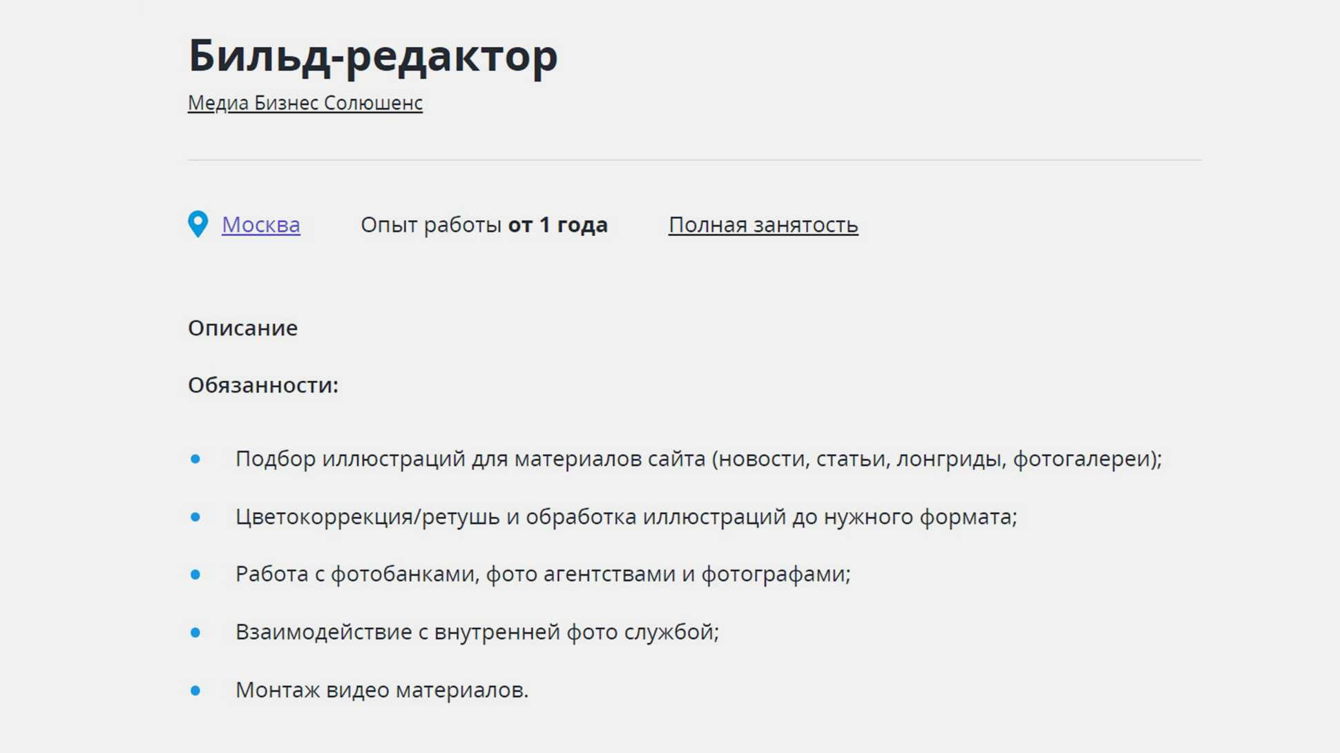 Пример вакансии с обязанностями удалённого бильд-редактораСкриншот: Rabota1000