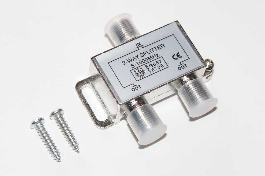 В первую очередь нам потребуется ТВ-сплиттер, или разветвитель. Это устройство способно разделить сигнал от антенны на несколько потоков (в нашем случае – два). То есть с одной стороны имеется вход, а с другой – несколько выходов для подключения к приемнику.