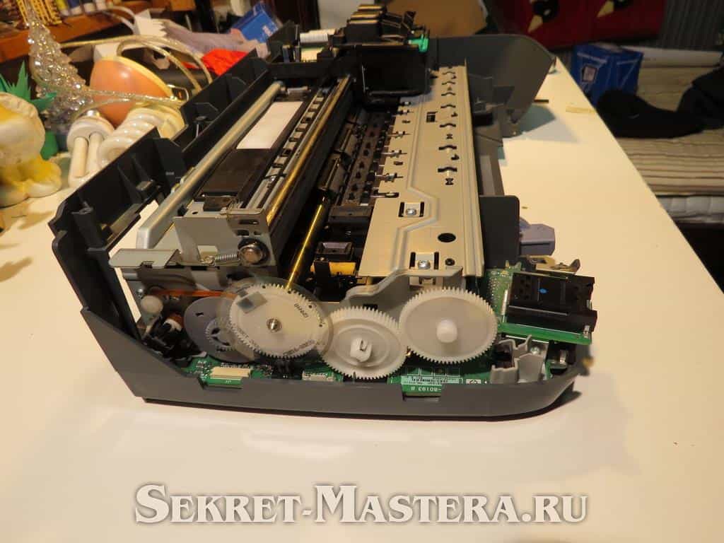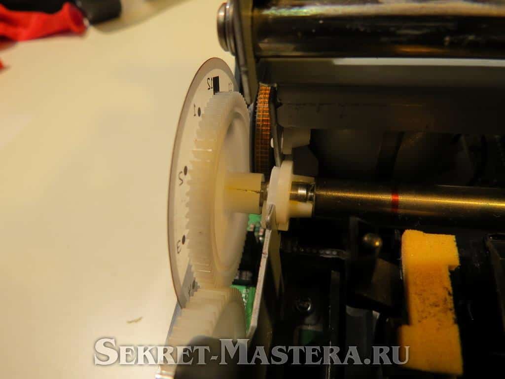 Слева находится редуктор и энкодер принтера, смотри фото (шестеренка с прикрепленной прозрачной пластинкой). Интересно, что некоторые мастера предлагали искать неисправность в загрязнении энкодера ))). Энкодер был девственно чист.