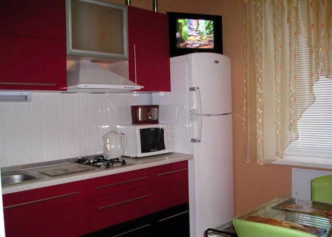 - использование специальной мебели. Телевизор вместе с холодильником можно поставить в отдельном шкафу. Это редкое функциональное решение, позволяющее выдержать единый стиль для всех элементов кухонного наполнения;