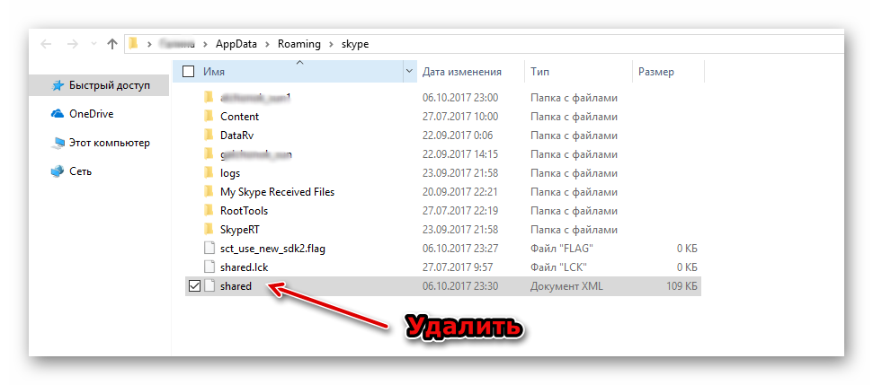 Закрой мессенджер, заверши процесс в «Диспетчере задач» (CTRL ALT DELETE) и вызови командную строку с помощью сочетания клавиш Win R. Здесь нужно прописать команду «%appdata%skype» и нажать «Ок». откроется папка, в которой необходимо удалить файл под названием «shared.xml». Удалил? Теперь снова запусти приложение – все должно заработать.