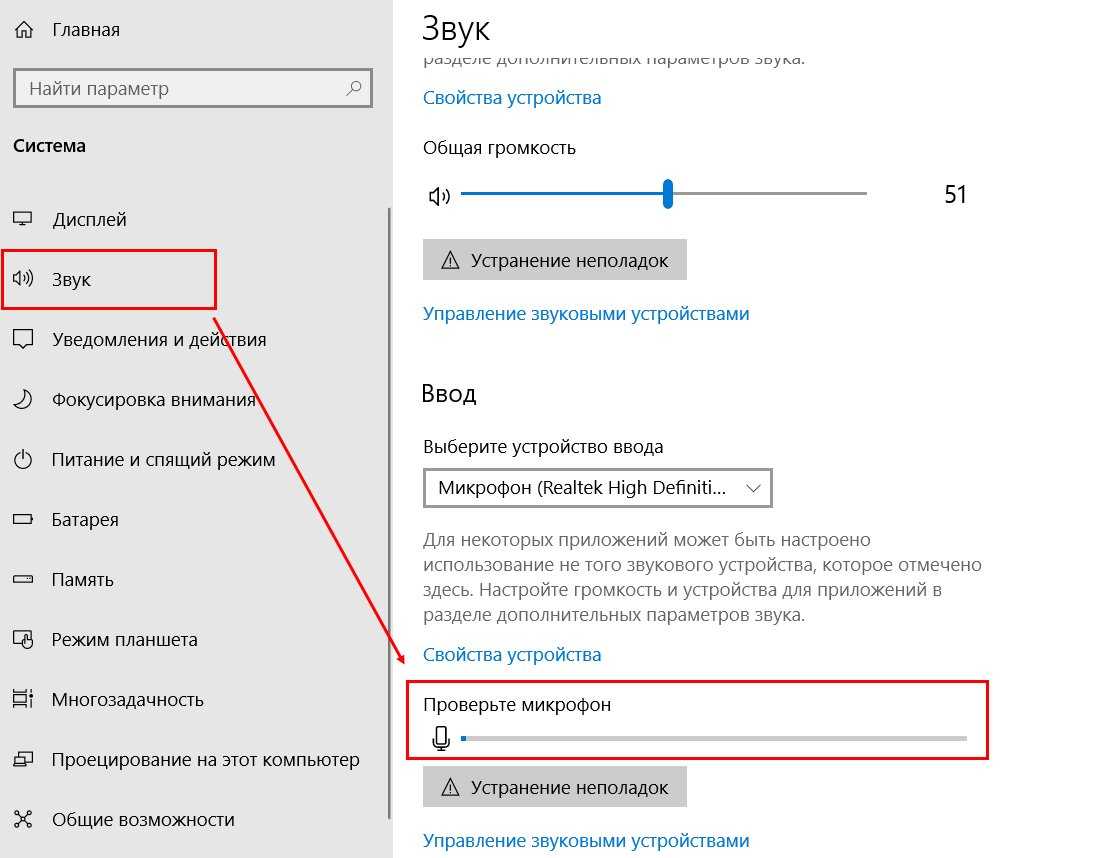 - Убедитесь, что в строчке Устройство ввода указан правильный микрофон.