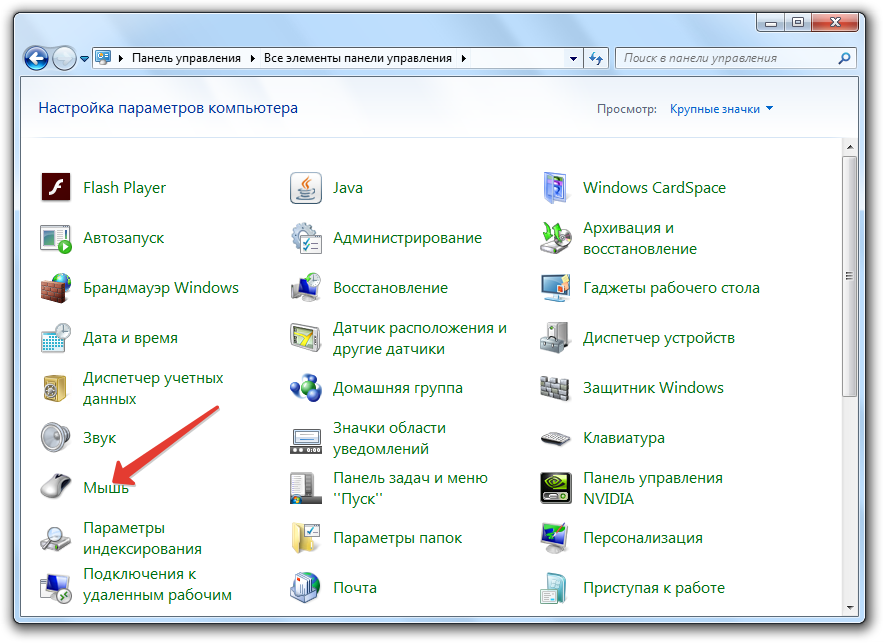 Откройте диалоговое окно настройки свойств мыши: Пуск — Панель управления Мышь.