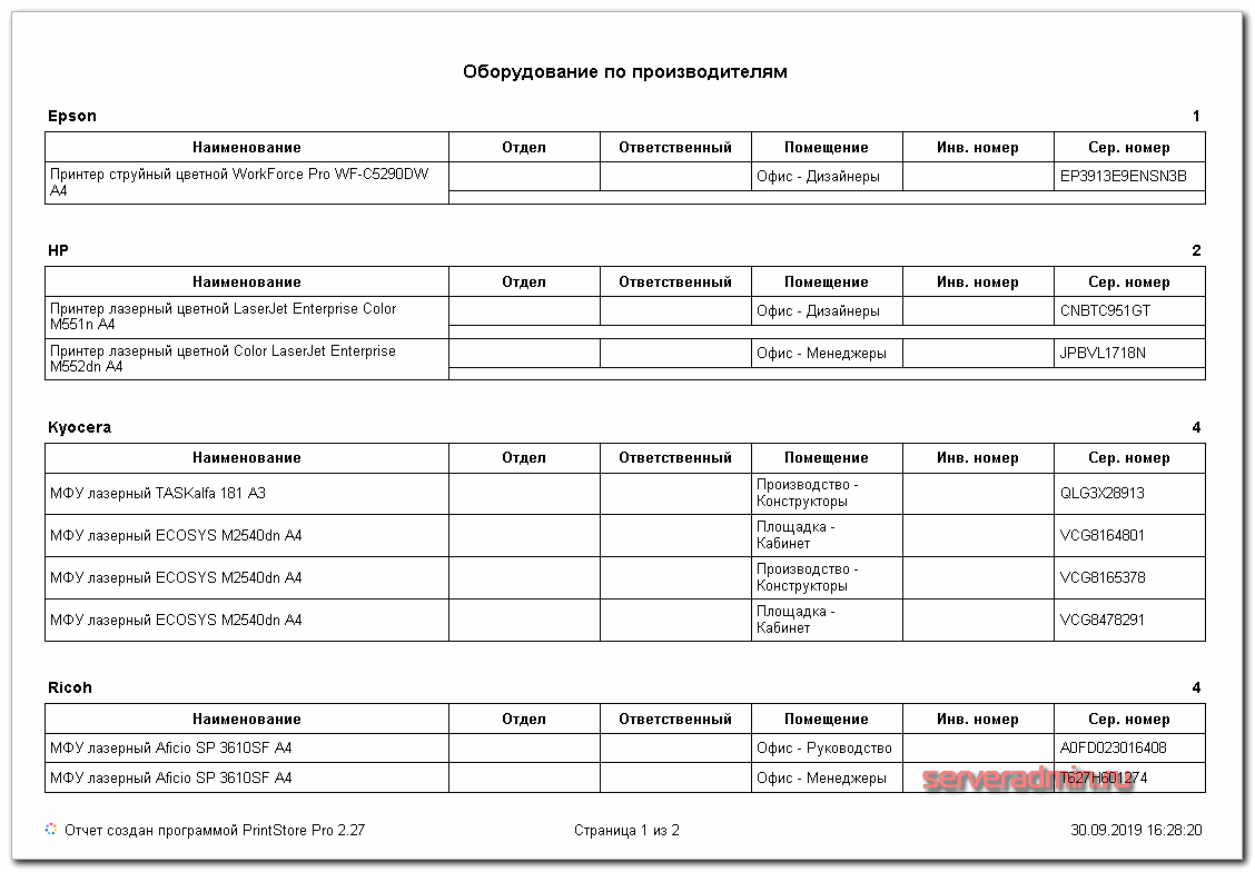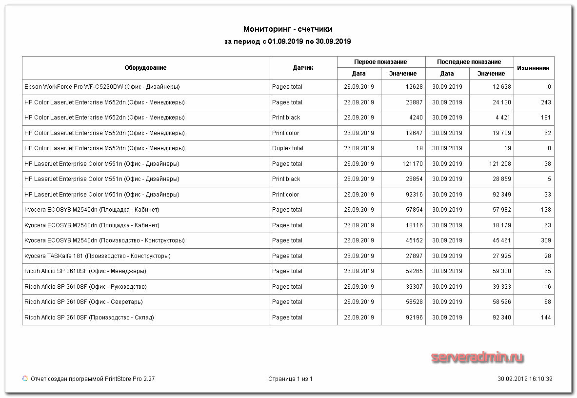 Пример отчета по счетчикам, где можно оценить количество напечатанных страниц по каждому принтеру на заданном интервале. У меня это несколько дней.