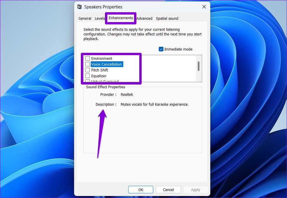 Шаг 4: Перейдите на вкладку «Улучшения» и найдите все доступные звуковые эффекты с описаниями.